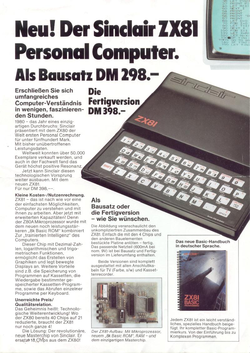 Der ZX 81 war eine kleine Revolution, denn er kam mit insgesamt nur vier ICs (!) aus. Dadurch konnte der Rechner sehr billig produziert werden; der ZX 81 war der erste Computer, der in Großbritannien für unter 100 Pfund gekauft werden konnte (als Bausatz, das Fertiggerät kostete etwas mehr). Die technischen Daten des ZX 81 sind eher bescheiden, in der Grundausführung hat der Rechner nur 1 KByte RAM, keine hochauflösende Grafik und keinen Sound. Allerdings kann der ZX 81 mit RAM-Packs bis zu 56 KByte hochgerüstet werden (64 KByte funktionieren nicht, da das ROM 8 KByte des Adressraums beansprucht). Die Bildaufbereitung beim ZX81 wird komplett von der CPU erledigt, dadurch wird der eigentlich recht flotte Takt von 3,25 MHz effektiv auf ca. ein Viertel gedrückt - was einer Taktrate von 800 kHz bis 900 kHz entsprechen würde. Wenn ein Bild dargestellt wird, können Programme nur zum Zeitpunkt des Bildwechsels abgearbeitet werden, also in den Austastlücken, in denen heute z.B. der Videotext liegt. Aus diesem Grund hat der Rechner zwei verschiedene Betriebsmodi, einen ohne (FAST) und einen mit Bildwiedergabe (SLOW). Diese Modi lassen sich per Basic-Befehl oder per Maschinensprache über Ansprung der Betriebssystemroutinen umschalten. Was die Betriebssicherheit angeht, sieht es beim ZX81 leider nicht sehr gut aus, Originalzitat von Karl-Heinz Mau: "Die Kiste stieg häufig ohne ersichtlichen Grund einfach aus (ZX81-Krankheit, nicht nur bei meinem). Meist dann, wenn man nicht gesichert hatte oder gar währenddessen. Wie oft habe ich damals das böse Wort mit S geschrien!" ;-) In den USA ist der ZX81 übrigens als TS-1000 von Timex-Sinclair vermarktet worden. Es gab auch einen größeren Bruder namens TS-1500, der mit 16 KByte RAM ausgeliefert wurde, sonst aber identisch war. Außerdem existieren noch diverse Clones des ZX81, wie z.B. der Lambda 8300.